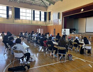 教材は折り紙飛行機を使い、真冬の開催となったため今回も製作・飛行とも体育館でした。