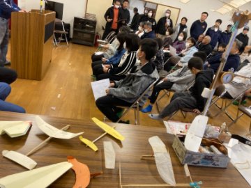 当日はあいにくの雨でしたが、会場の小岩戸集落センターには舞台のある小さめのホールが備わっており、室内で折紙飛行機の指導をしました。
